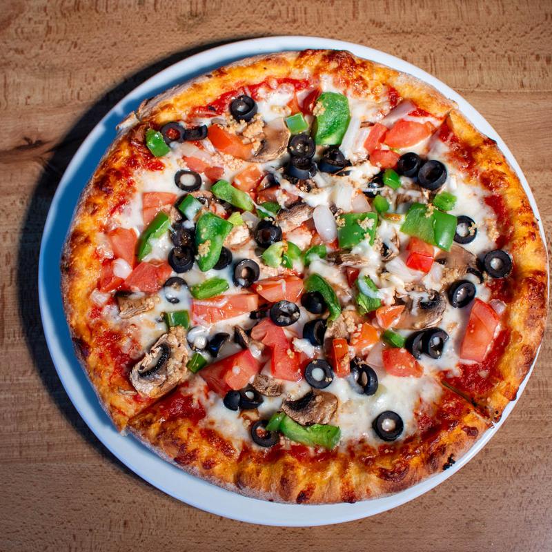 Mushrooms, onions, olives, green peppers, tomatoes, garlic.