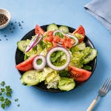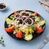 Lettuce, tomato, cucumber, kalamata olives, onions, feta cheese.
