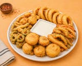 Zucchini sticks, fried mushrooms, jalapeno poppers, mozzarella sticks, and onion rings.
